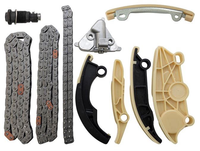 Knastkæde reparations sættet indeholder 3 nye kæder, 5 kædestyr, 2 kædestrammere, så du har de dele der skal bruges til et knastkæde skift på 2,0 Ingenium motoren