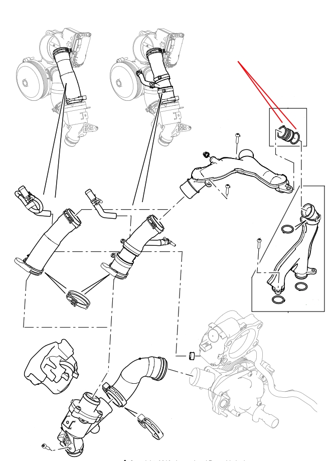 Land Rover kølevands plastik grenrørs O-ring der tætner den øverste del af der sidder lodret ned i motorblokken beregnet til 5,0 V8 Supercharged, 5,0 V8 NA, og 3,0 V6 Supercharged motorerne - Opdateret version der også kræver udskiftning af den øverste del af grenrøret.