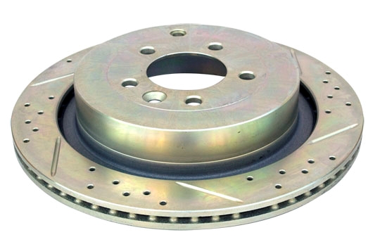 Land Rover Sports bremese skive bestående af borede og fræste bremse skiver til begge baghjul - Bremseskivernes huller sørger for at den varme gas fra bremseklodserne bliver ledt væk fra klodsens friktions flade og de tværgående indfræsninger sørger samtidig for at sports bremseskiverne lettere kan holde bremseklodserne rene under hård belastning.